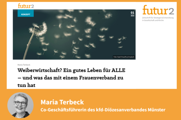 Wie die Gemeinwohl-Ökonomie (GWÖ) dabei helfen kann und was das mit der kfd zu tun hat, damit und den gesellschaftlichen Herausforderungen unserer Zeit, setzt sich Maria Terbeck, Geschäftsführerin kfd-Diözesanverband Münster in futur2, der Zeitschrift für Strategie & Entwicklung in Gesellschaft und Kirche auseinander und bringt sie in Beziehung zu den Werten der Gemeinwohlökonomie.