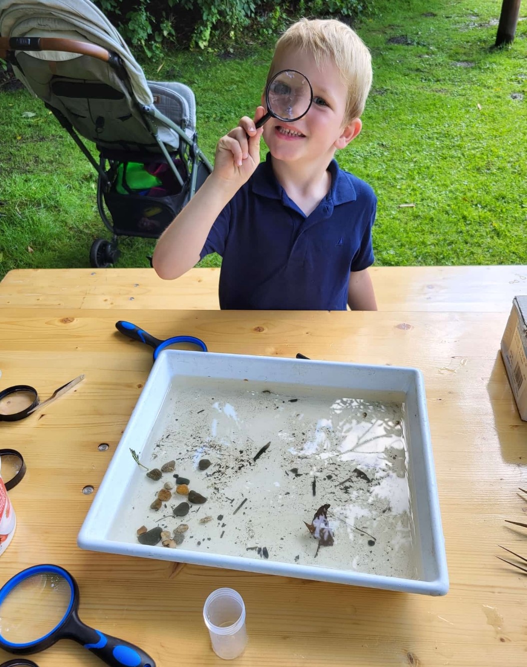 Eine Woche später, am Mittwoch den 17.07, wurde die Exkursion am Barfußweg fortgesetzt und diesmal zum Thema Erde. Zusammen mit Anne Halbuer machten sich 26 Teilnehmer*innen erstmal barfuß mit dem Boden vertraut. Anschließend wurde gebuddelt und gegraben, um zusammen zu schauen, was wohl so alles im Boden krabbelt. Verschiedene Ringelwürmer, Schnecken, Asseln und Tausendfüßler wurden gefunden und mit Lupen untersucht.
