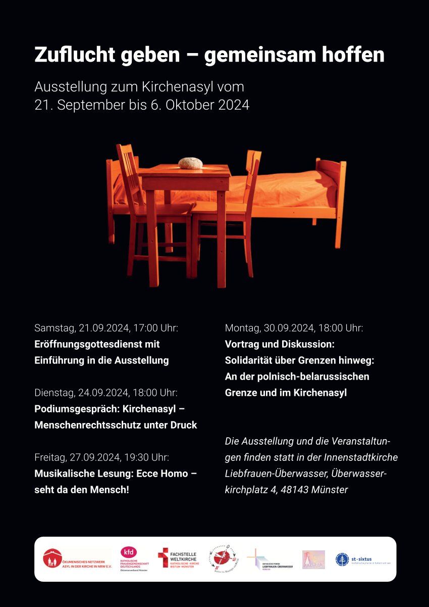 Jeder Mensch verdient ein Zuhause – dafür stehen wir als kfd. Gerade in Zeiten verschärfter Migrationspolitik bleiben die Leben einzelner Menschen auf der Strecke. Ein Kirchenasyl kann helfen, einzelne vor einem unmenschlichen Schicksal zu bewahren. Ein Kirchenasyl braucht viel Engagement, Durchhaltevermögen und Arbeit. In der Ausstellung Zuflucht geben – gemeinsam begegnen wir Menschen, die schutzsuchend und schutzgebend ein Kirchenasyl erlebt haben.