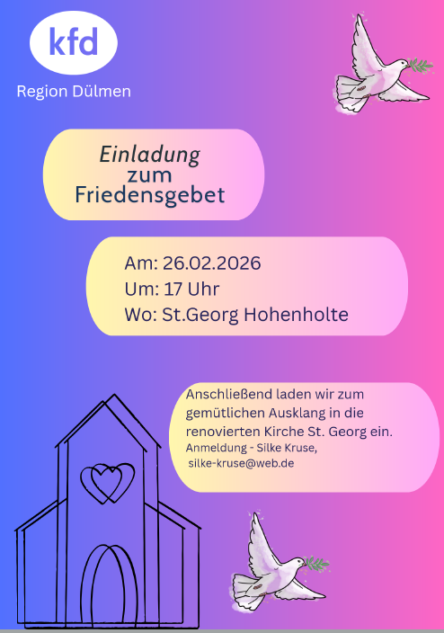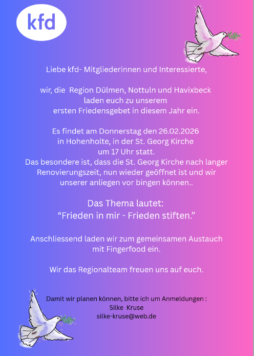 wir, die Region Dülmen, Nottuln und Havixbeck laden euch zu unserem ersten Friedensgebet in diesem Jahr ein.