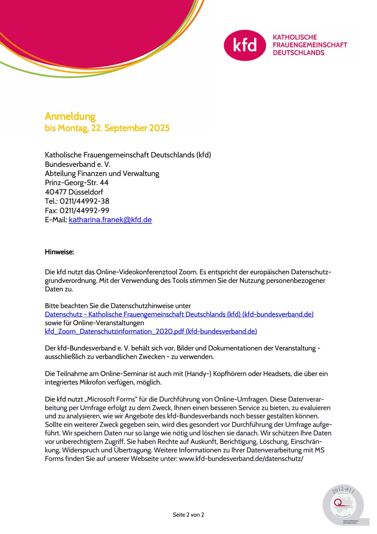Anmeldung über die kfd-Bundesgeschäftsstelle per E-Mail an laureen.polychronakis@kfd.de