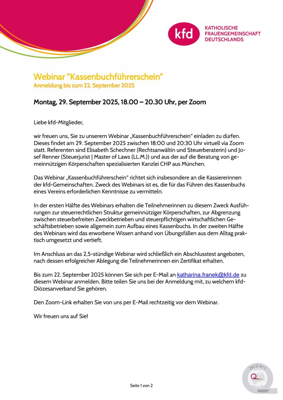 Den Zoom-Link erhalten Sie per E-Mail rechtzeitig vor dem Webinar.