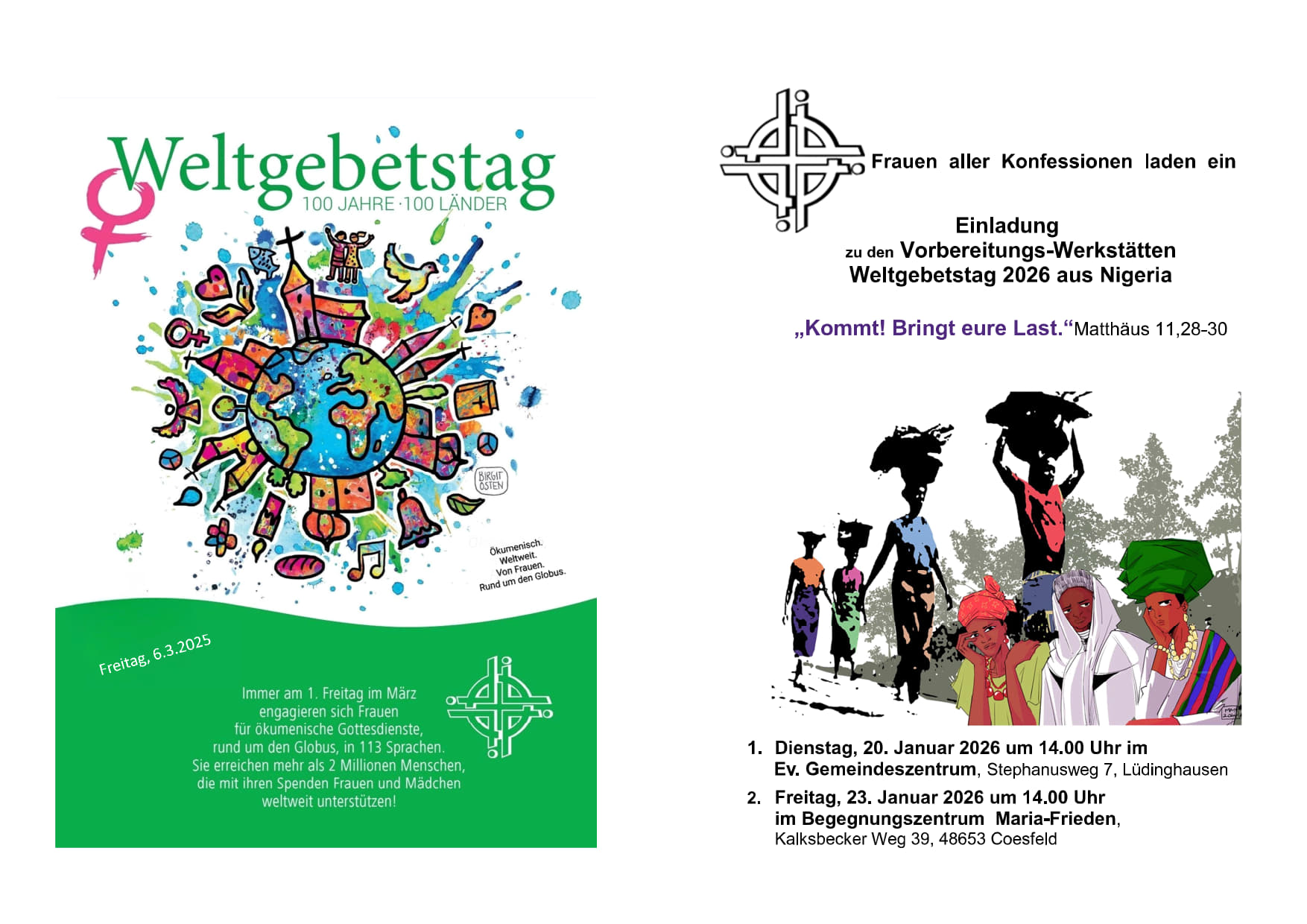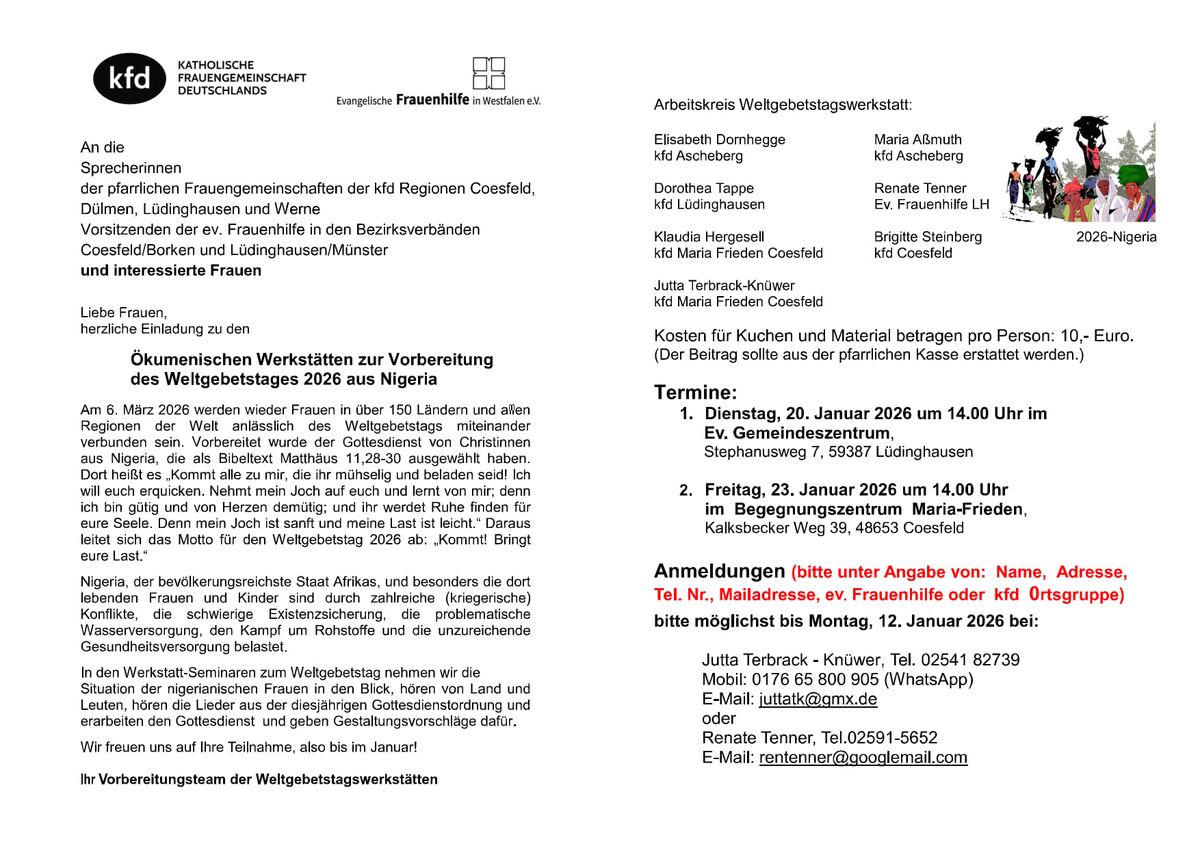 Einladung der kfd-Regionen Coesfeld zu den Vorbereitungs-Werkstätten Weltgebetstag 2026 aus Nigeria